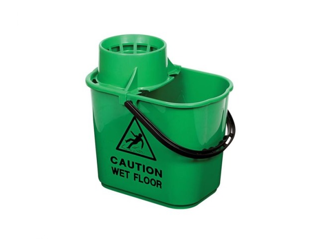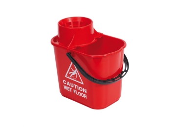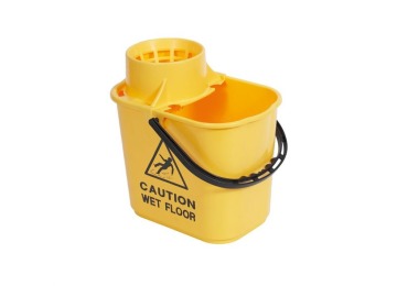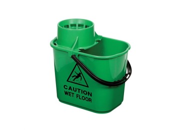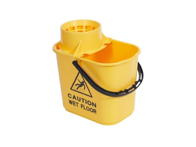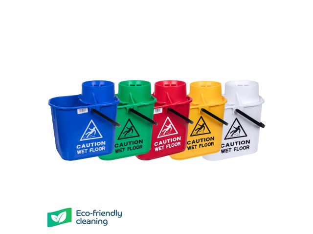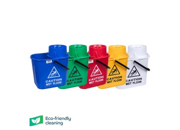 A sturdy polypropylene bucket with a high profile clip on wringer to reduce spillage. Printed with ‘Caution wet floor’ on two sides and graduation marks.