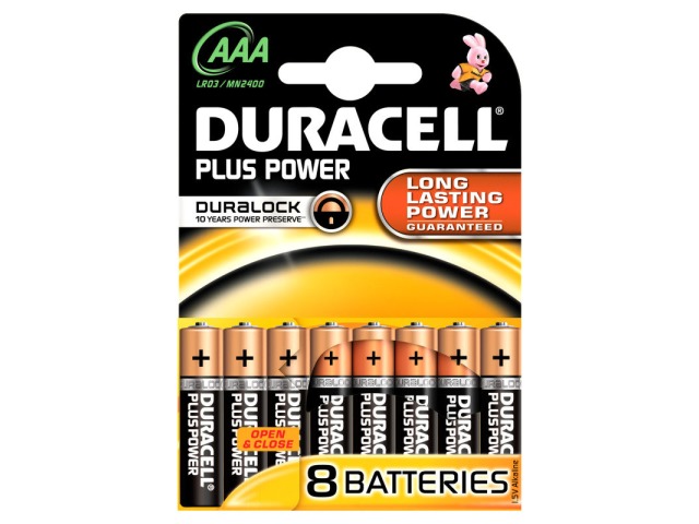 8x AAA Duracell Plus Power Alkaline Batteries. 1. 5V, LR03. Duracell Plus Power gives you reliable performance and long lasting power in a broad range of everyday devices. You can rely on Duracell Plus to power your remote controls, CD players, motorized toys, flashlights, toothbrushes, etc. Pack of 8× 1. 5V alkaline batteries. Battery type AAA, LR03, 1. 5V. Always read label.