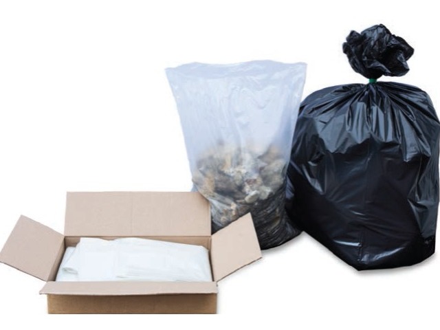 These black bin bags are bundled in quantities of 100 pieces per carton, neatly arranged in four sets of 25 bags each. Each bag is sized at 18×34×41 inches, offering ample capacity for waste disposal and management.