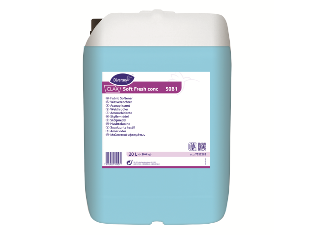 Fabric Softener Description Clax Soft Fresh conc is a fabric softening liquid specially formulated for use in commercial and on premise laundries. The product is suitable for application on most types of fabric and can be manually or auto-dosed. Key properties Clax Soft Fresh conc is a concentrated fabric conditioner based on biodegradable cationics, quaternary ammonium salts. In the wash solution, these positively charged cationics, adsorb to the negatively charged surface of fabrics. Once adsorbed onto fabric the cationic has a lubricating effect. During the drying process, this prevents interlocking of individual fibres and build-up of static electricity (especially on synthetic fibres). In addition lubrication facilitates ironing/calendering. The product has also been formulated with perfume, which leaves a pleasant smell on fabric. Clax Soft Fresh conc can be used for most types of fabrics, but is particularly effective on bulked or textured fabrics such as towels. It also imparts a smooth, silky feel on woven or flat knitted fabric. Benefits • Good softening of many types of fabric (towels, sheets, wool, delicate articles etc) • Prevents build-up of static electricity on synthetic fabrics • Delivers a pleasant residual smell • Is based on biodegradable raw materials Use instructions Dosing level is dependent on wash classification. The softener should be applied in the last rinse of a washer extractor or in the last section of a continuous batch washer. Dosage recommendation: 3 - 6 ml/ kg dry goods Please note that this product should not be used on: articles made of micro polyester fibres such as cleanroom garments and water repellent theatre linen and cleaning microfibre cloths/wipes