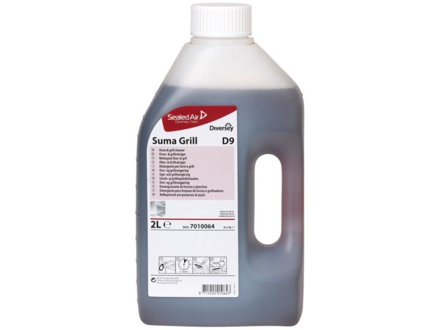 Suma Grill D9 is a dark brown coloured liquid supplied in 2 litre ready-touse bottles and in a 10-litre concentrate for use with the JohnsonDiversey