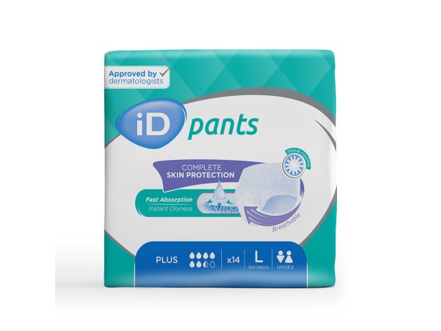 ID Pants Plus absorbent briefs are designed to get the most out of life. They are an ideal solution to deal with moderate to severe incontinence. Easy to use, Pants ID can be worn and removed like any other undergarment. The elasticized zones and their outer veil with a "cotton feel" combine comfort and discretion.
