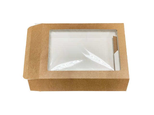 Introducing our eco-friendly disposable Kraft windowed platter boxes, designed for style and sustainability. Crafted from widely recycled board and compostable PLA film, these boxes not only look great but also minimize environmental impact. Ideal for showcasing sandwiches, salads, cakes, and more, they offer convenient side-loading for easy filling with food inserts. Perfect for displaying your delicious offerings elegantly, whether for delivery or takeaway.