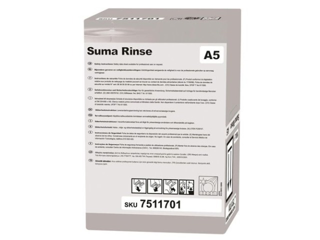 Suma Rinse A5 is a low foam general purpose rinse additive for machine ware washing. Key properties Suma Rinse A5 is a standard neutral rinse additive. It has been specially formulated for use in a wide range of ware washing machines. The product contains a special blend of non-ionic surfactants for rapid and spot and streak free drying on all cleaned surfaces in soft and medium hard water conditions.