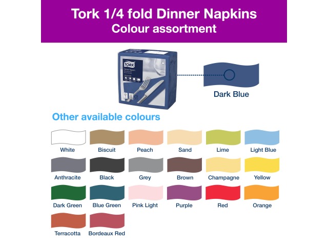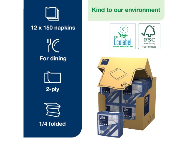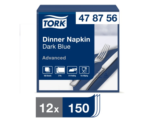Tork Dark Blue Dinner Napkin, 1/4 Fold 2-ply, 39 cm x 39 cm, 12 x 150 napkins, 478756